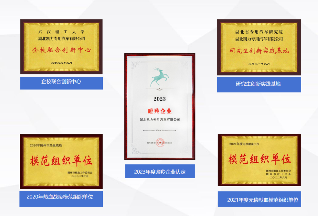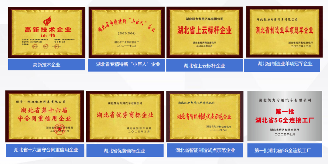 凯力汽车集团不仅与湖北省专用汽车研究院深化合作,挂牌成立“研究生创新实践基地”,还与武汉理工大学合作成立“校企联合创新中心”,同时还是国家高新技术企业、湖北省专精特新“小巨人”企业、湖北省上云标杆企业、湖北省智能制造试点示范企业、第一批湖北省5G全连接工厂。