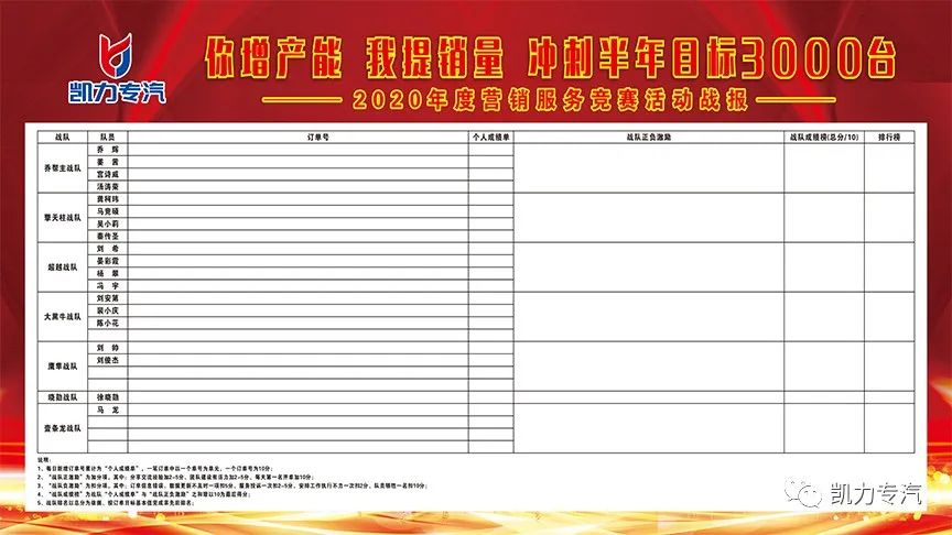 为全面配合 “奋战六十天、增产一千台、助力七十亿” 的生产经营活动,保证增产提能的活动效果,提高公司订单销量,加大公司市场营销力度,有效拉动公司产、销同步增长,4月17日湖北凯力专汽同步开展了以 “你增产能,我提销量,冲刺半年目标3000台” 为主题的营销服务竞赛活动。