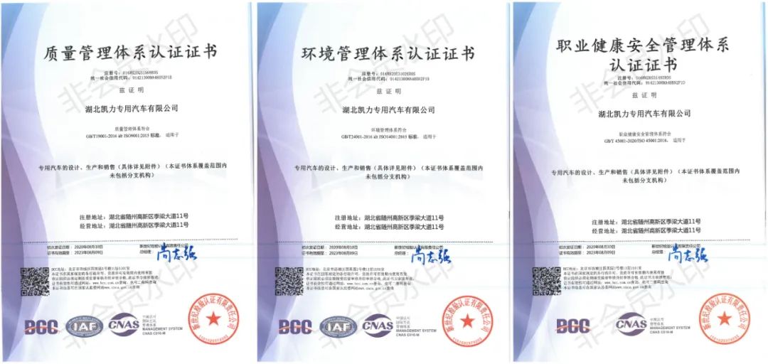 凯力专汽不断地优化管理,持续改进机制。顺利通过“三体系”(质量管理体系、环境管理体系、职业健康与安全管理体系)认证。