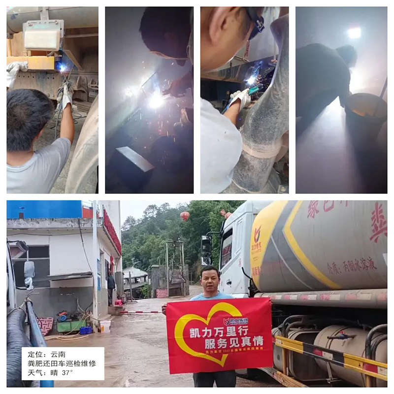 云南,售后人员接到三年前的老客户电话,驱车一百多公里,对客户车辆进行全方位体检,冒着四五十度的罐内高温进入罐内检查,对于车辆脱焊位置进行补焊。