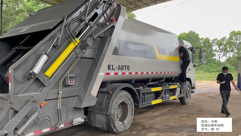 云南,售后人员对于客户压缩垃圾车进行巡检和日常保养知识讲解。