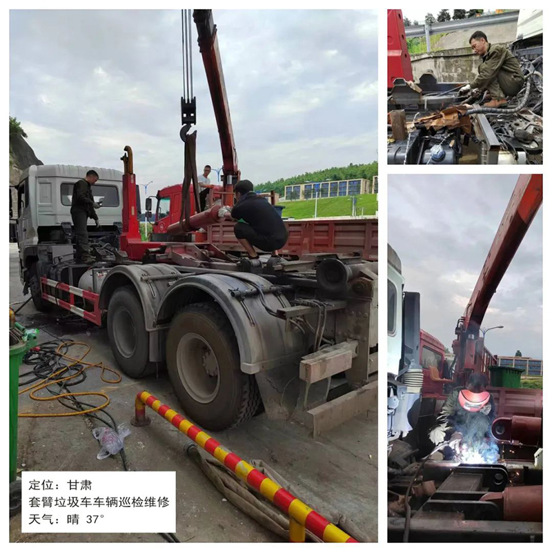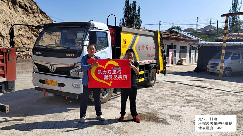 甘肃,36度高温天气,地表温度达到45度以上,售后团队顶着烈日,对十余台压缩垃圾车进行车辆巡检、维护、操作培训以及答疑解惑。