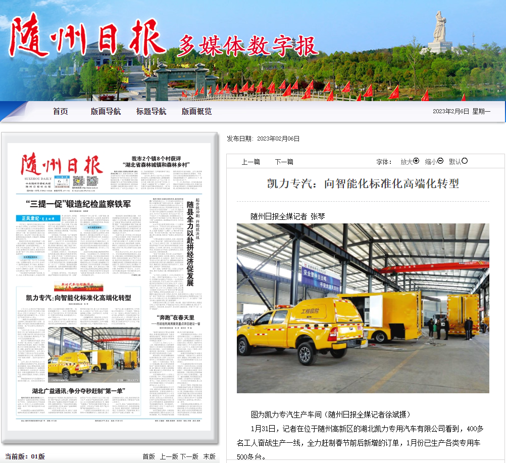 随州日报以《凯力专汽:向智能化标准化高端化转型》为题进行头版报道。